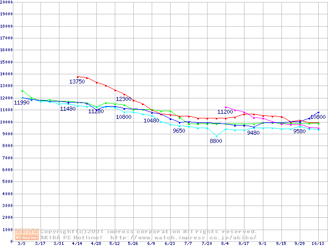 | [↑前グラフ]: | HDD 10GB~20GB未満(7200rpmクラス)の最安値推移 |