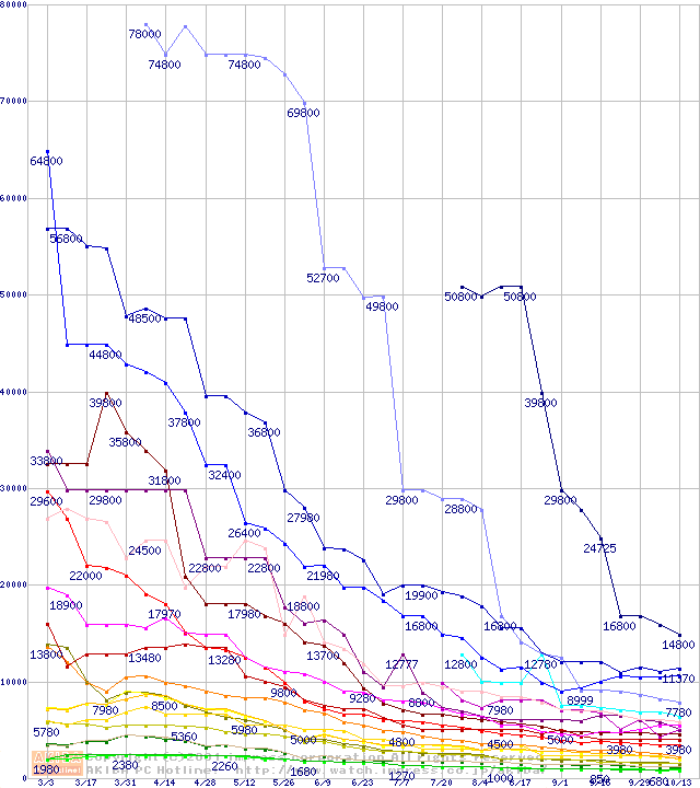 メモリ主要製品(最安値1万円以上)の最安値推移