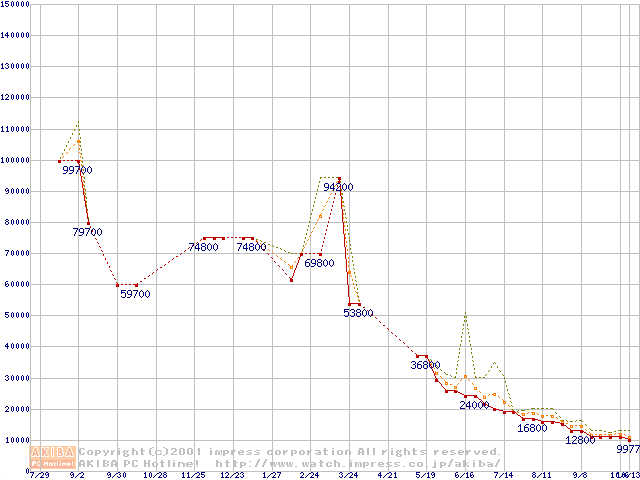 PC133 SDRAM DIMM CasLatency=3 ECC対応の最安値推移