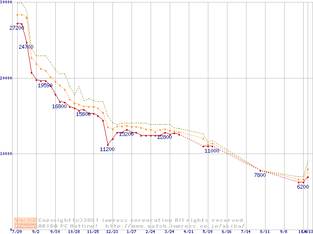 Socket A (Thunderbird,PGA,FSB 200MHz,L2 256KB)の最安値推移