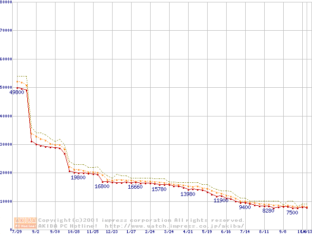 Socket A (Thunderbird,PGA,FSB 200MHz,L2 256KB)の最安値推移