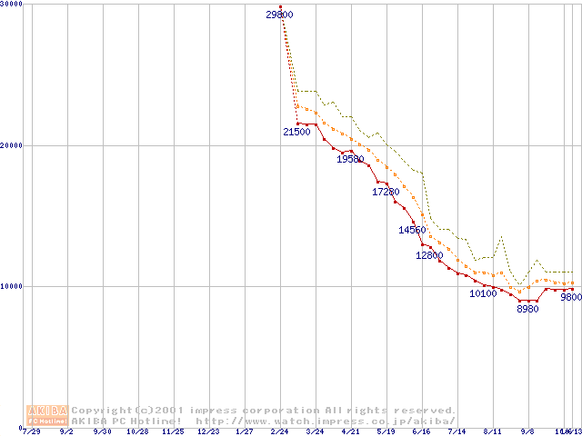 Socket A (Thunderbird,PGA,FSB 266MHz,L2 256KB)の最安値推移