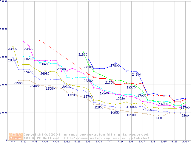 | Socket A (Thunderbird,PGA,FSB 266MHz,L2 256KB)の最安値推移(テスト公開中) |