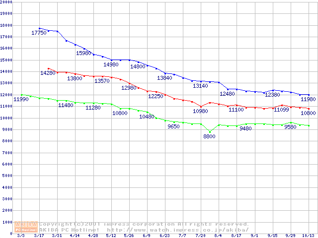 | [↑前グラフ]: | Barracuda ATA IV (7200rpm UltraATA/100 2MB 40GB/Platter)の最安値推移 |