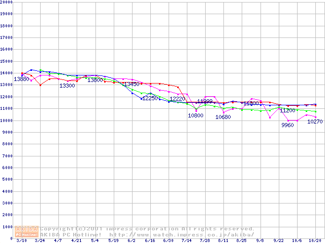 | [↑前グラフ]: | HDD 20GB~30GB未満(7200rpmクラス)の最安値推移 |
