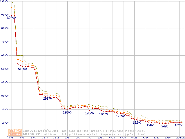 Socket A (Thunderbird,PGA,FSB 200MHz,L2 256KB)の最安値推移