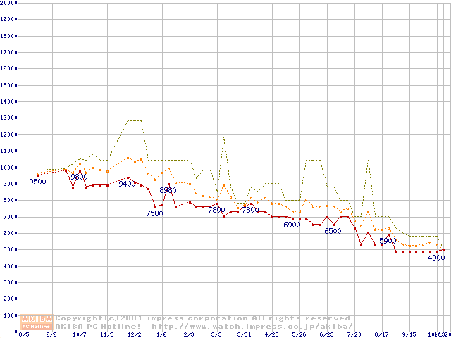 Socket 370 (PPGA,FSB 66MHz,L2 128KB)の最安値推移