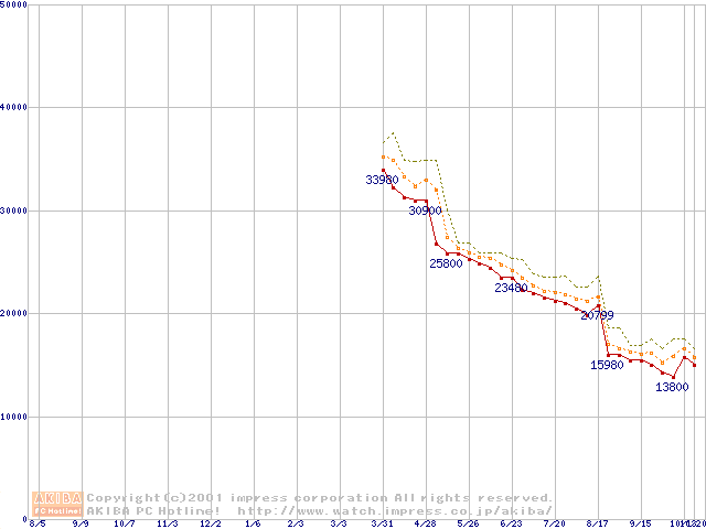 Athlon 1.3GHz(FSB200) (Thunderbird) リテールパッケージの価格推移