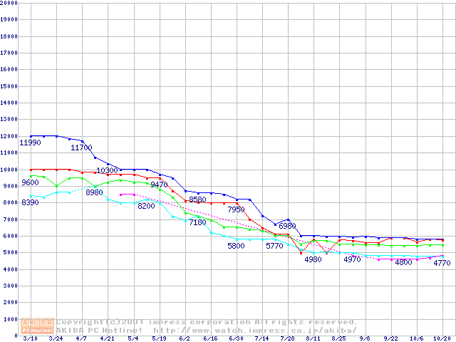 | Socket 370 (FC-PGA,FSB 66MHz,L2 128KB)の最安値推移(テスト公開中) |