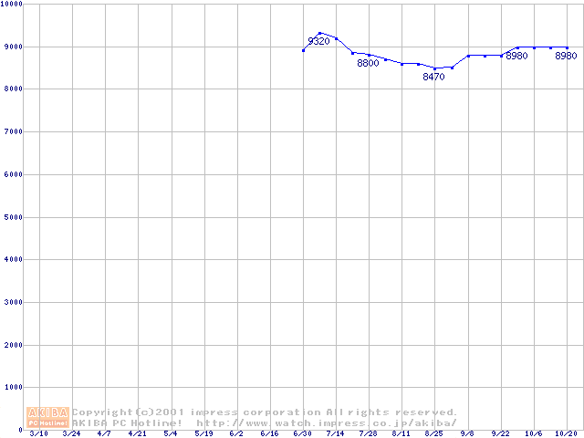 | [↑前グラフ]: | DiamondMax 536DX (5400rpm UltraATA/100 33.3GB/Platter)の最安値推移 |