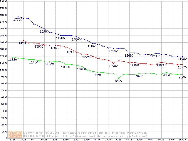 | [↑前グラフ]: | Barracuda ATA IV (7200rpm UltraATA/100 2MB 40GB/Platter)の最安値推移 |