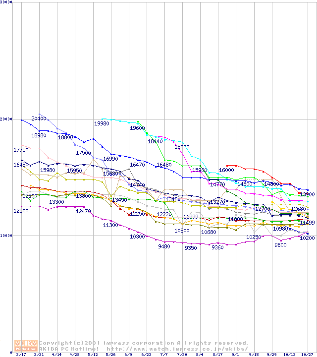 HDD主要製品(最安値1万5千円~2万円未満)の最安値推移