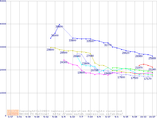 | [↑前グラフ]: | HDD 60GB~80GB未満(5400rpmクラス)の最安値推移 |