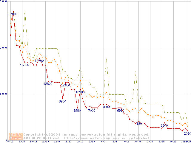 PC133 SDRAM DIMM CasLatency=3 ECC対応の最安値推移