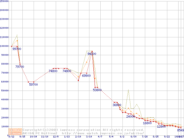 PC133 SDRAM DIMM CasLatency=3 ECC対応の最安値推移