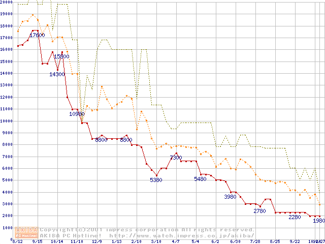 PC100 SDRAM DIMM CasLatency=2 ECC対応の最安値推移