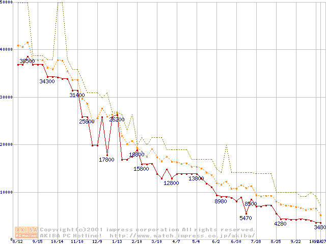 PC100 SDRAM DIMM CasLatency=2 ECC対応の最安値推移