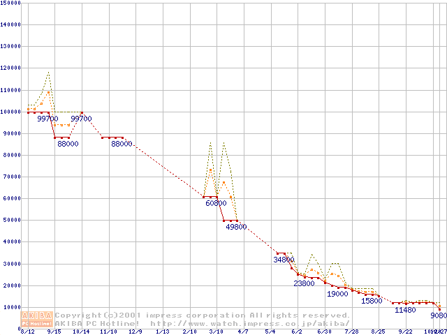 PC100 SDRAM DIMM CasLatency=2 ECC対応の最安値推移