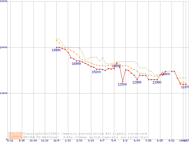 HDD主要製品(最安値1万円~1万5千円未満)の最安値推移