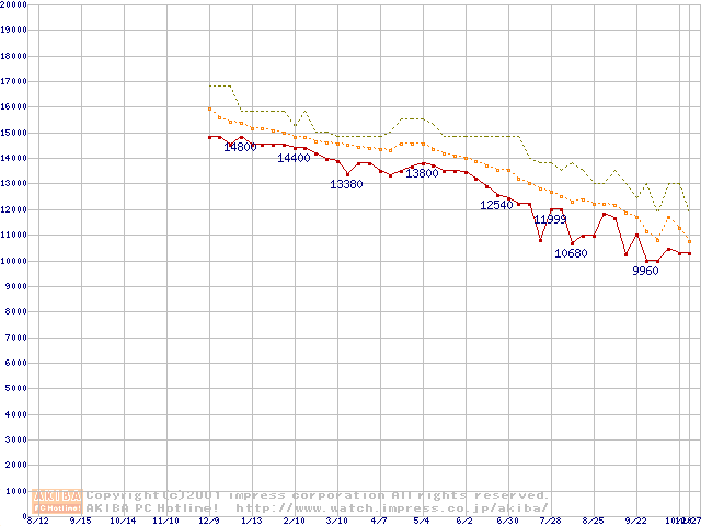 HDD主要製品(最安値1万円~1万5千円未満)の最安値推移