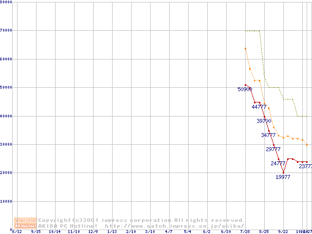 PC133 SDRAM DIMM CasLatency=3 ECC対応 Registeredタイプの最安値推移