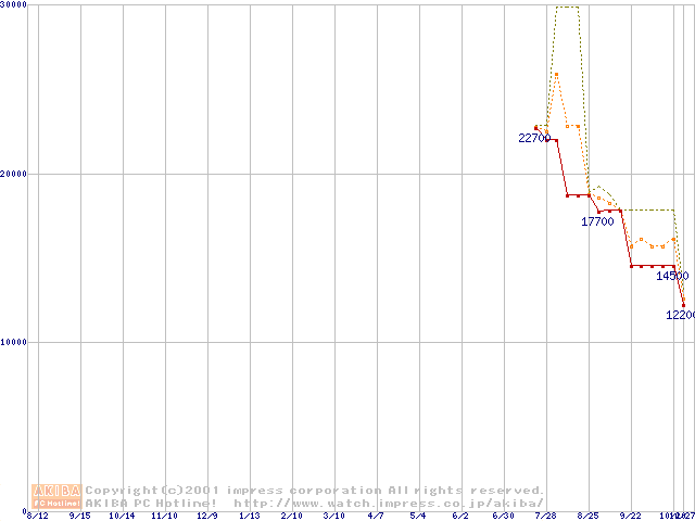 PC100 SDRAM DIMM CasLatency=2 ECC対応 Registeredタイプの最安値推移