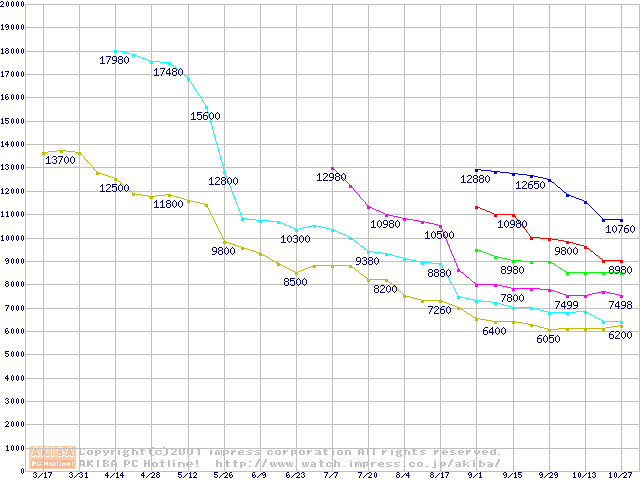 | [↑前グラフ]: | Socket 370 (FC-PGA2,FSB 100MHz,L2 256KB)の最安値推移 |