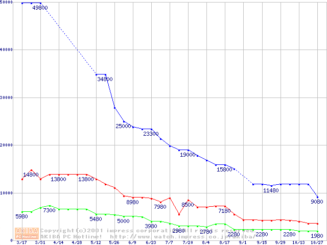| [↑前グラフ]: | PC100 SDRAM DIMM CasLatency=2の最安値推移 |