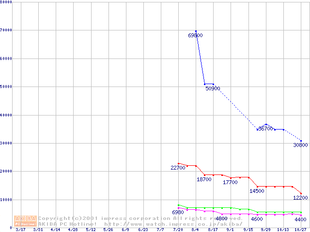 | [↑前グラフ]: | PC100 SDRAM DIMM CasLatency=2 ECC対応の最安値推移 |