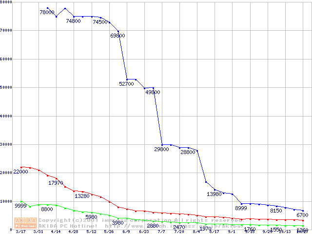 | [↑前グラフ]: | PC100 SDRAM DIMM CasLatency=2 ECC対応 Registeredタイプの最安値推移 |