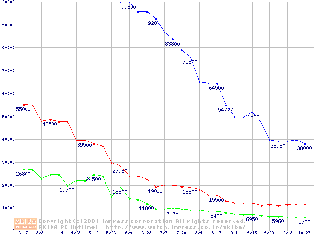 | [↑前グラフ]: | PC800 DRDRAM RIMMの最安値推移 |