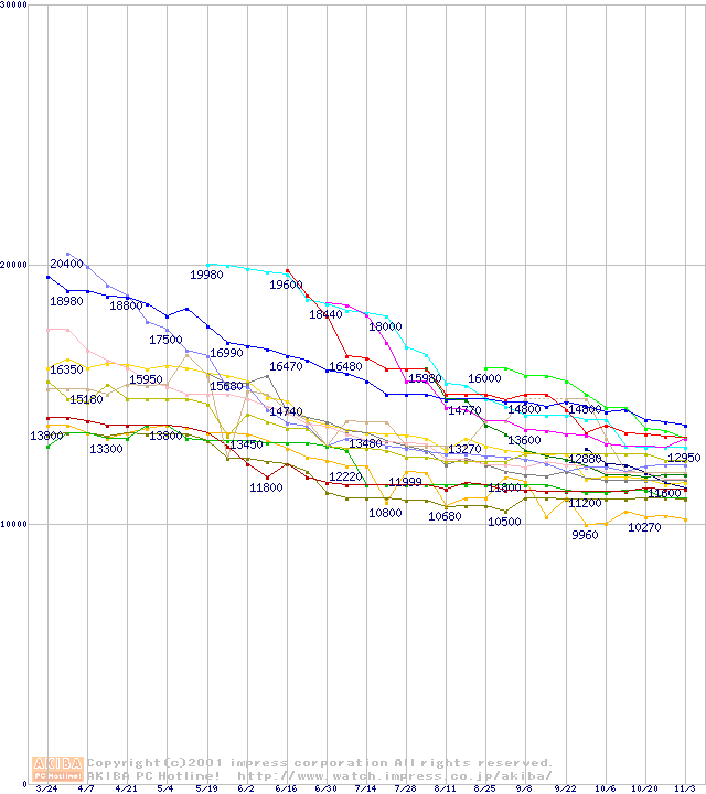HDD主要製品(最安値1万5千円~2万円未満)の最安値推移
