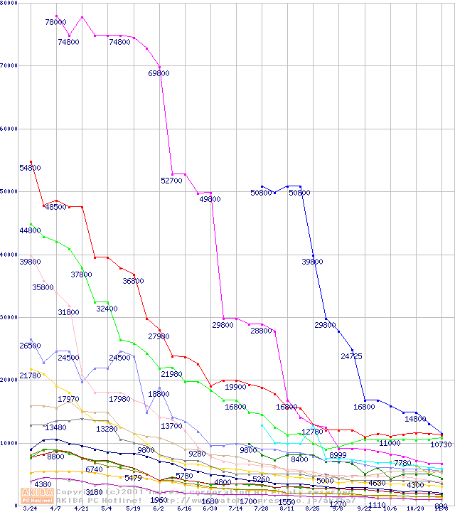 メモリ主要製品(最安値1万円以上)の最安値推移
