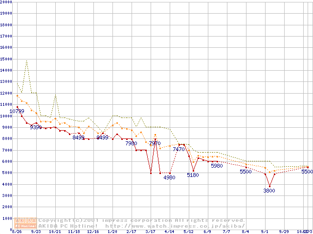 Socket 370 (FC-PGA,FSB 66MHz,L2 128KB)の最安値推移