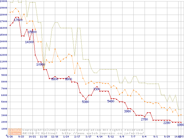 PC100 SDRAM DIMM CasLatency=2 ECC対応の最安値推移