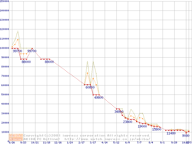 PC100 SDRAM DIMM CasLatency=2 ECC対応の最安値推移