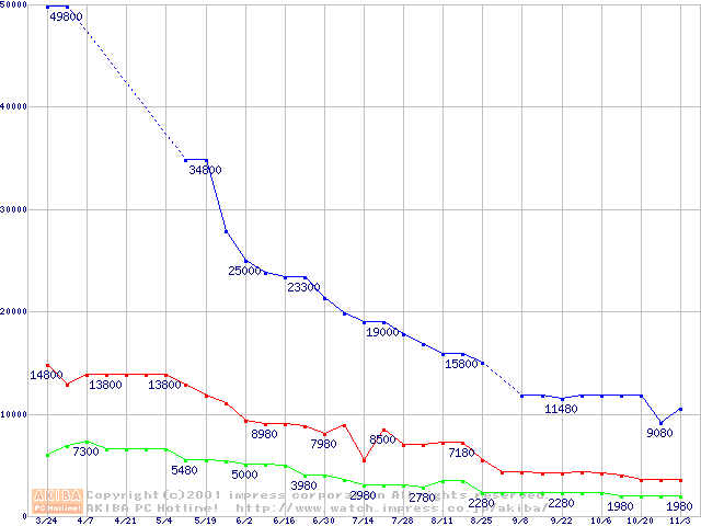 | [↑前グラフ]: | PC100 SDRAM DIMM CasLatency=2の最安値推移 |