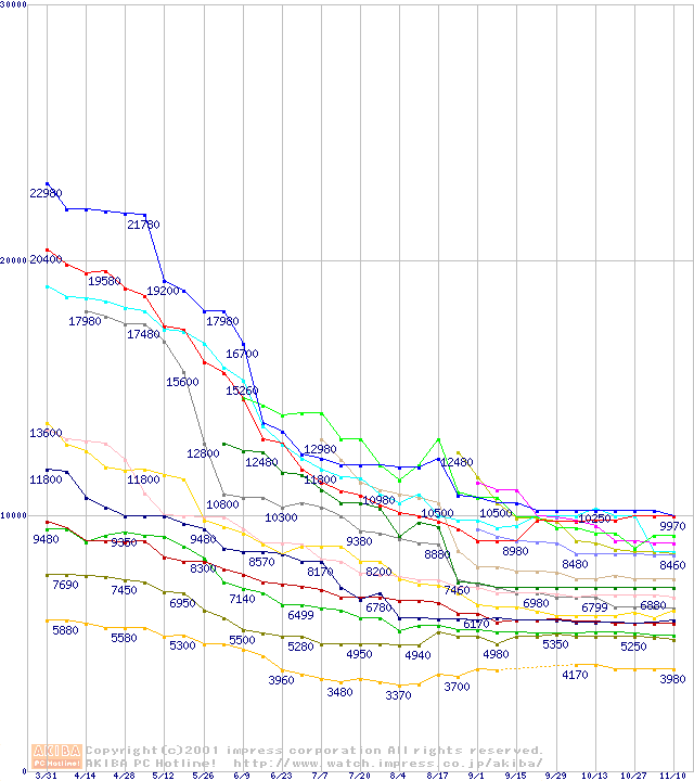 CPU主要製品(最安値1万円~2万円未満)の最安値推移