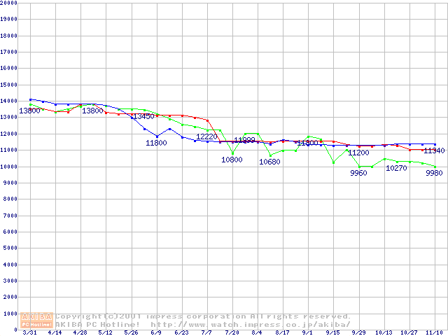 | [↑前グラフ]: | HDD 20GB~30GB未満(7200rpmクラス)の最安値推移 |