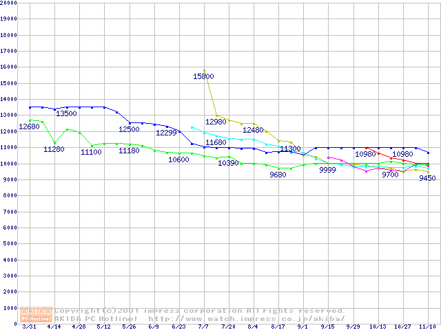 | [↑前グラフ]: | HDD 30GB~40GB未満(5400rpmクラス)の最安値推移 |