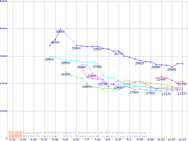 | [↑前グラフ]: | HDD 60GB~80GB未満(5400rpmクラス)の最安値推移 |