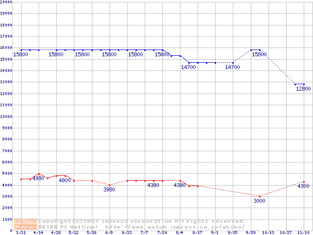 | [↑前グラフ]: | Socket A (Spitfire,PGA,FSB 200MHz,L2 64KB,1.4V)の最安値推移 |