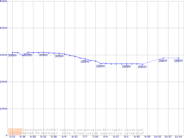 | [↑前グラフ]: | Deskstar 60GXP (7200rpm UltraATA/100 2MB)の最安値推移 |