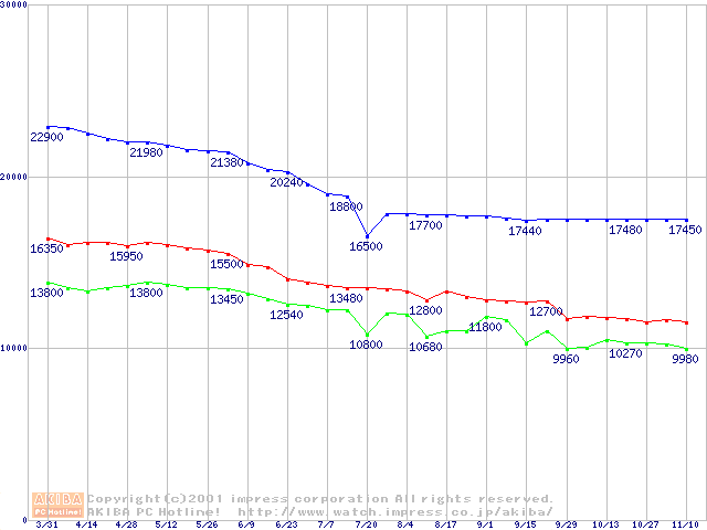 | [↓次グラフ]: | DiamondMax D540X (5400rpm UltraATA/100 40GB/Platter)の最安値推移 |