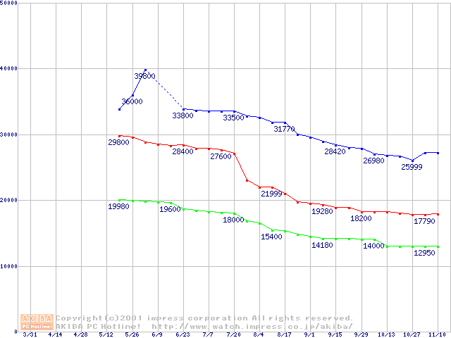 | [↑前グラフ]: | DiamondMax D540X (5400rpm UltraATA/100 40GB/Platter)の最安値推移 |