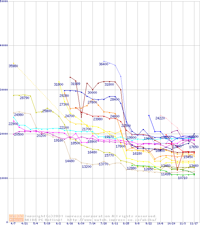 CPU主要製品(最安値1万円~2万円未満)の最安値推移