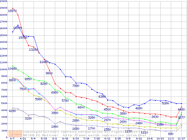 メモリ主要製品(最安値5千円未満)の最安値推移