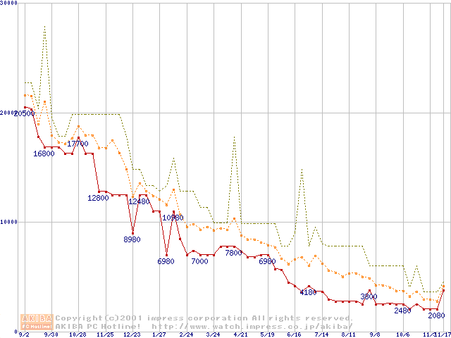 PC133 SDRAM DIMM CasLatency=3 ECC対応の最安値推移