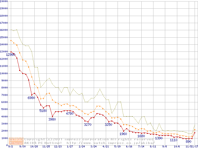 PC100 SDRAM DIMM CasLatency=2の最安値推移