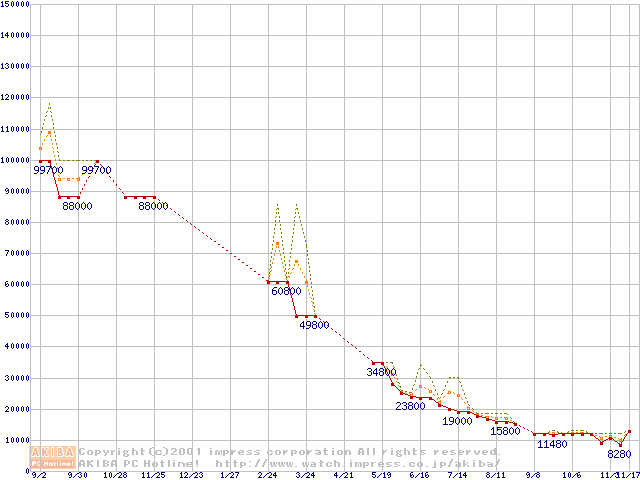 PC100 SDRAM DIMM CasLatency=2 ECC対応の最安値推移